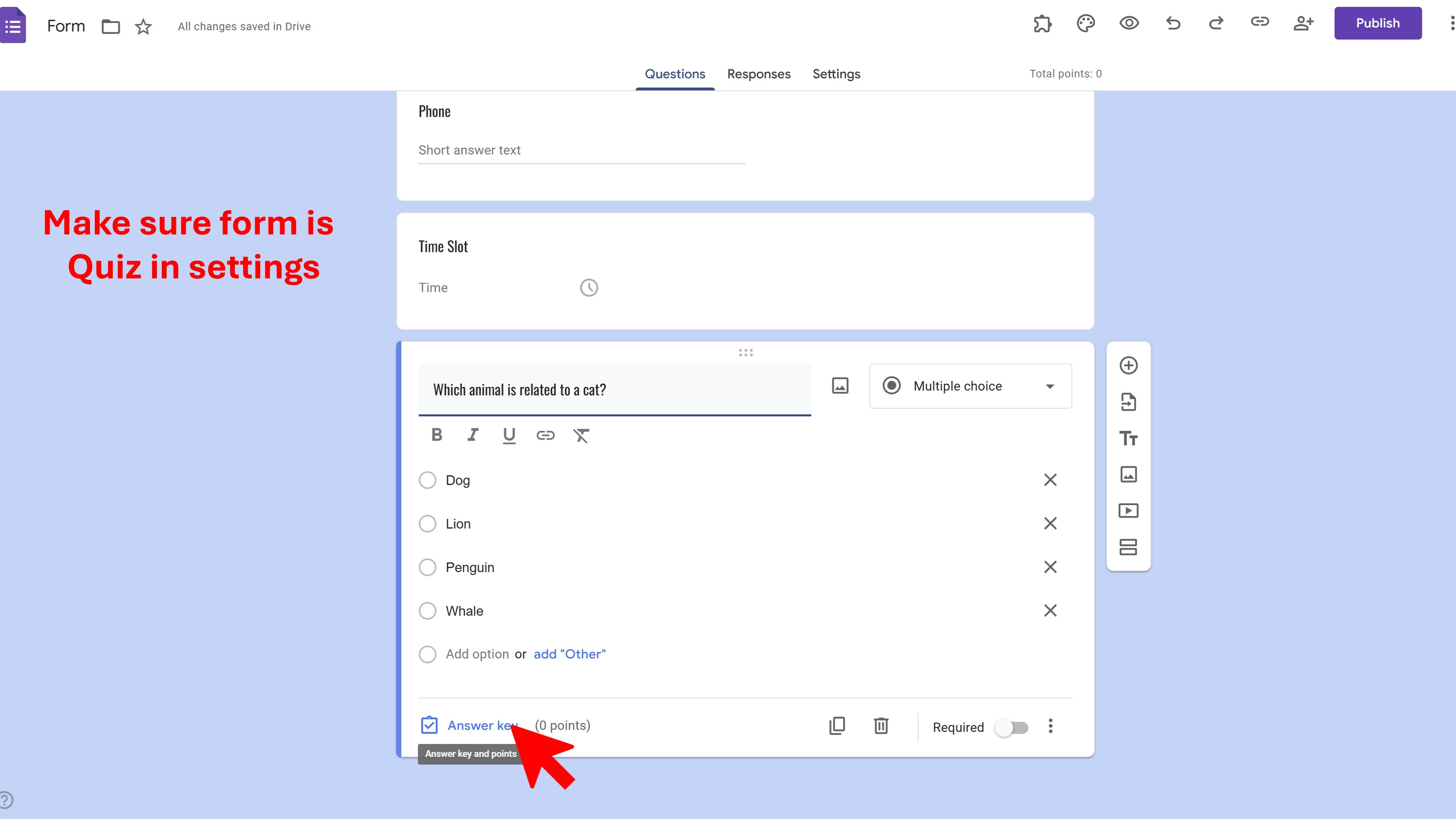 Choose how many points this question is worth. You can do this by clicking on the 'Answer Key' and typing in the number of points in the box that appears.