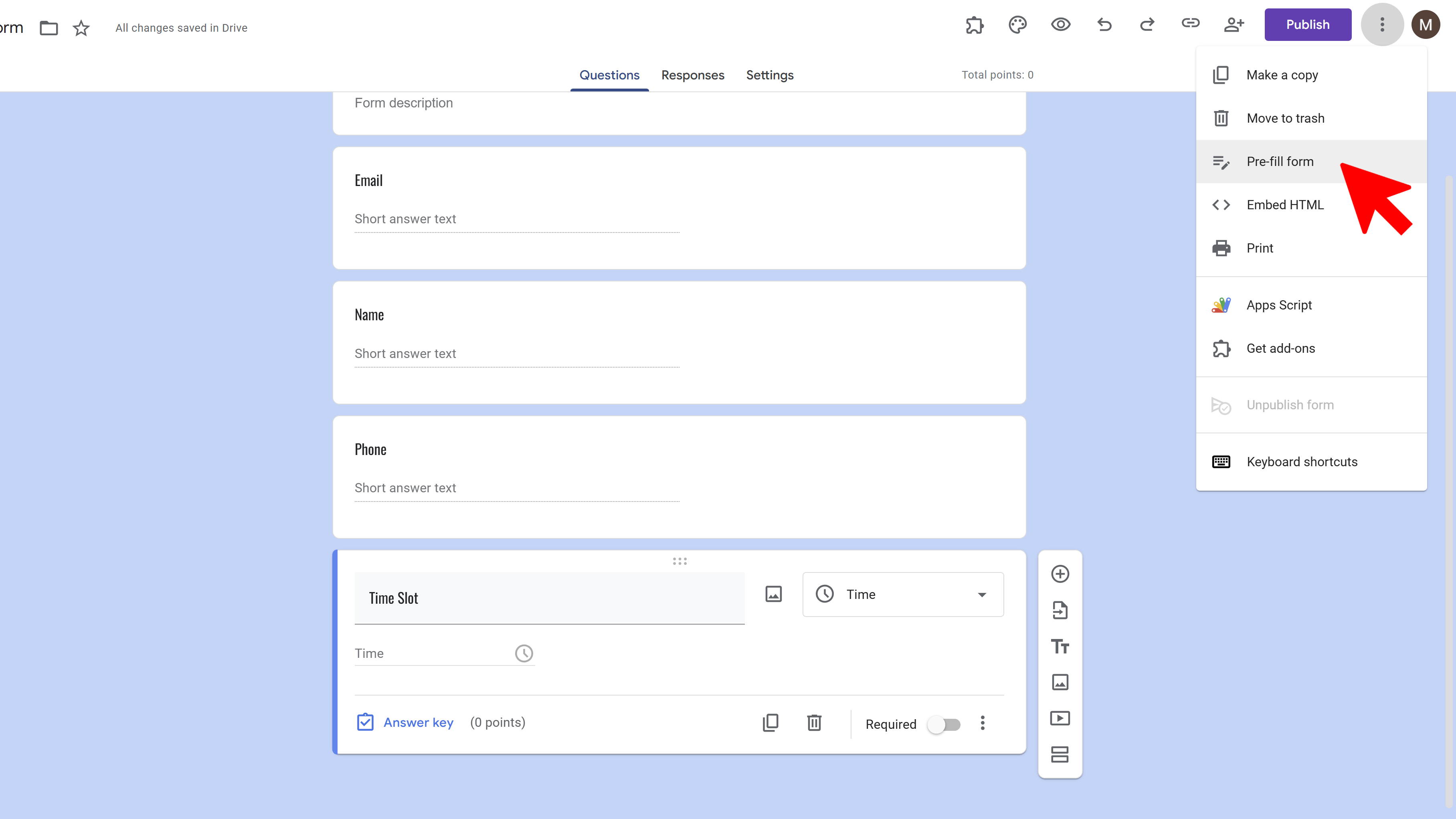 Go to the top right of the page, and click on the three vertical dots to open a dropdown menu. From this menu, select 'Get pre-filled link'.