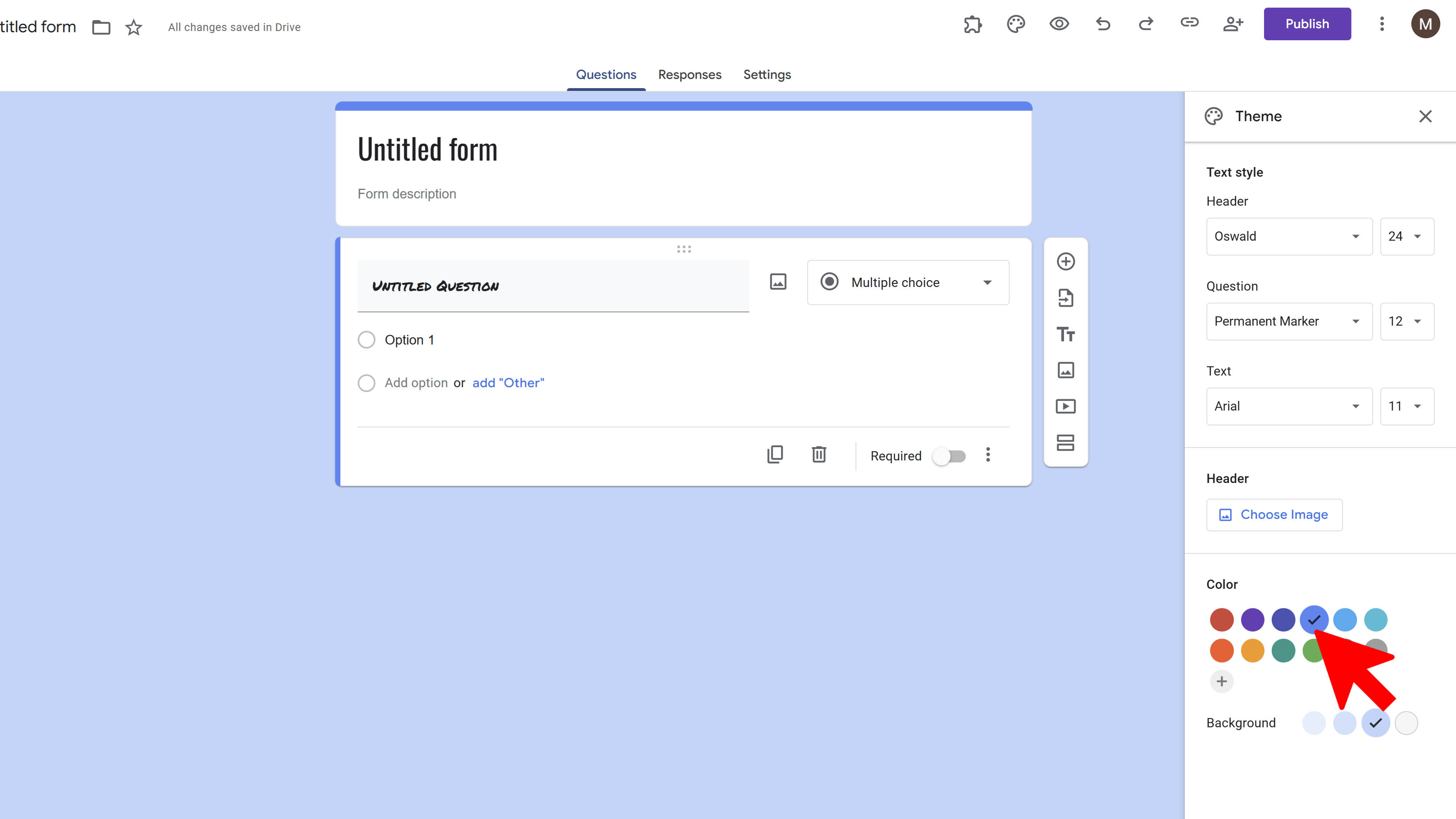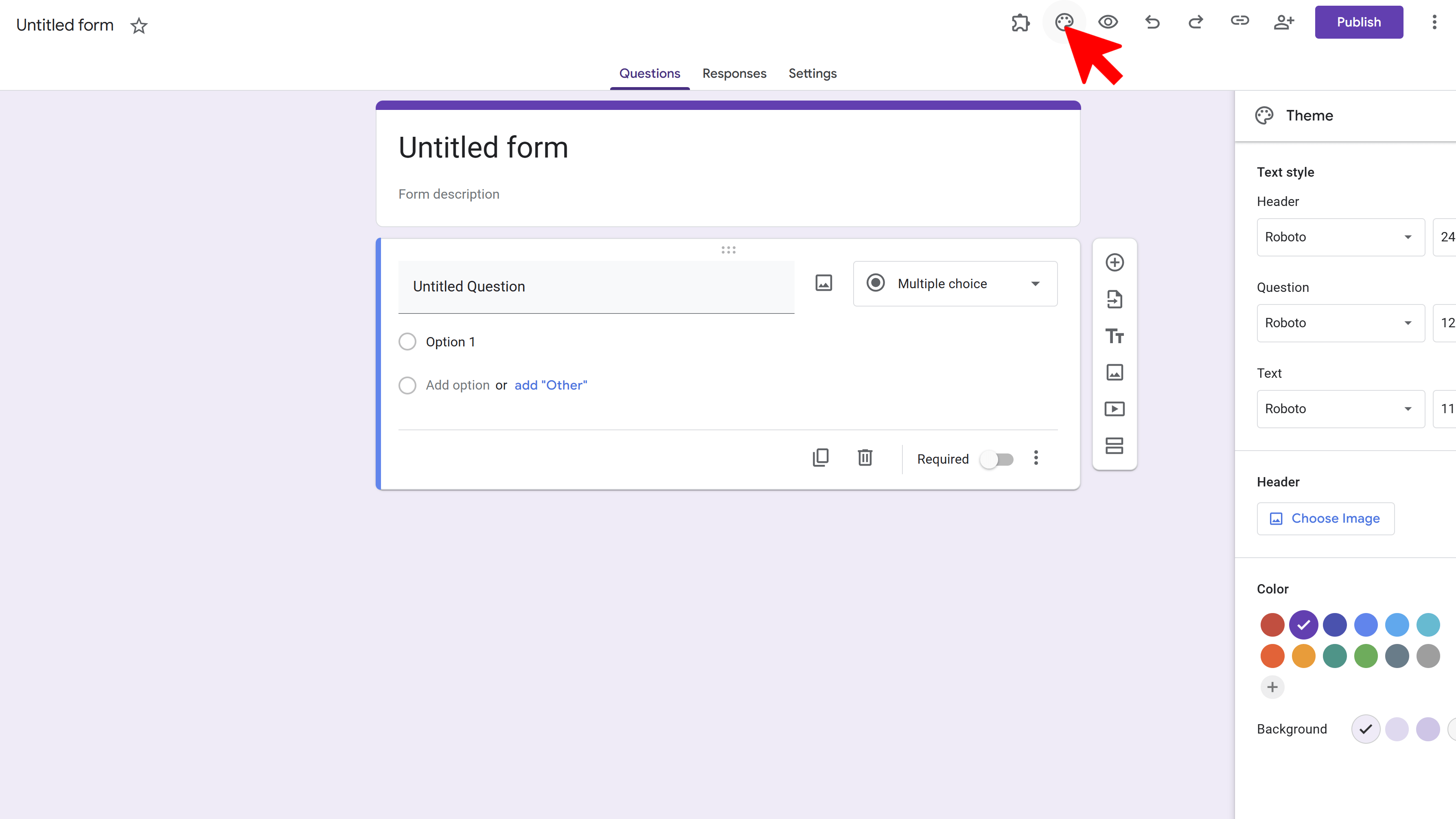 Click on the palette icon at the top of the page. Here, you can change the color of your form and also add a custom image as the header.